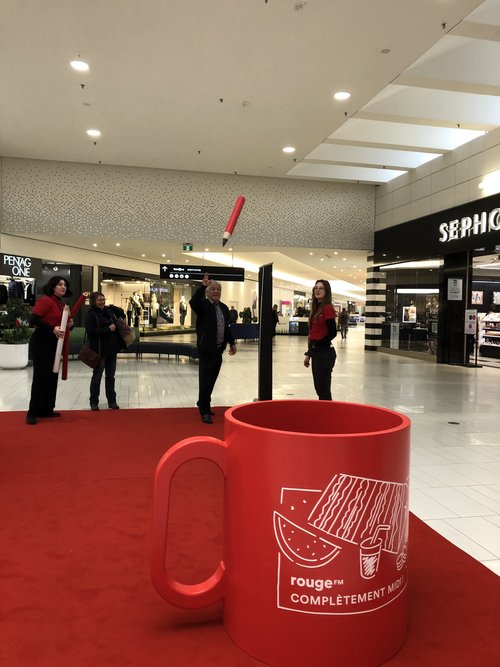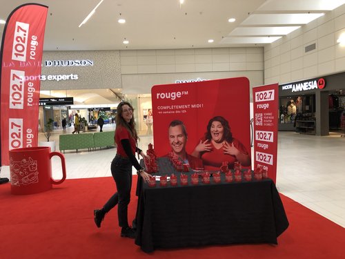 Création d'une zone complétement rouge pour rappeler l’identification de la station et mettre de l’avant le jeu ludique du « lancer du crayon dans la tasse » afin de permettre aux participants de remporter des prix instantanés.